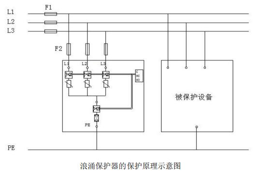 交流浪涌保護器用于交流電源的第二級(C 級)雷電過電壓保護,三相浪涌保護器采用-3防護電路,如下圖所示。