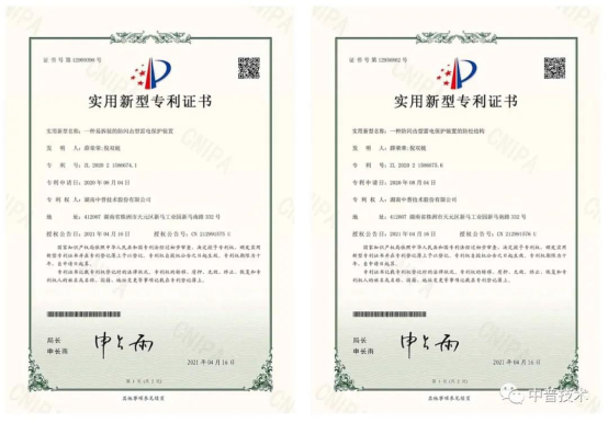 2021年4月16日,國(guó)家知識(shí)產(chǎn)權(quán)局分別授予了“一種易拆裝的防閃擊型雷電保護(hù)裝置(專利號(hào):ZL202021586674.1)”、“一種防閃擊型雷電保護(hù)裝置的防松結(jié)構(gòu)(專利號(hào):ZL202021586675.6)”實(shí)用新型專利權(quán)。截止至目前,公司共有授權(quán)專利134項(xiàng),其中發(fā)明專利16項(xiàng),實(shí)用新型專利96項(xiàng),外觀專利22項(xiàng)。